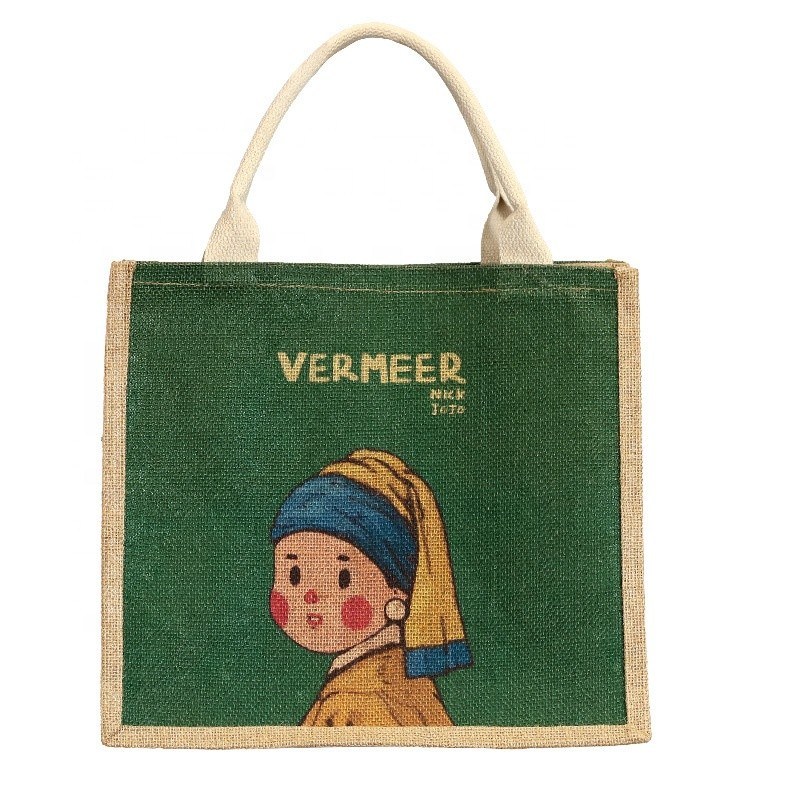 Printed Jute Tote Bag Burlap handbag laminated with interior Resuable Shopping Bags